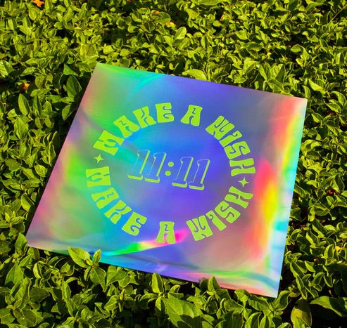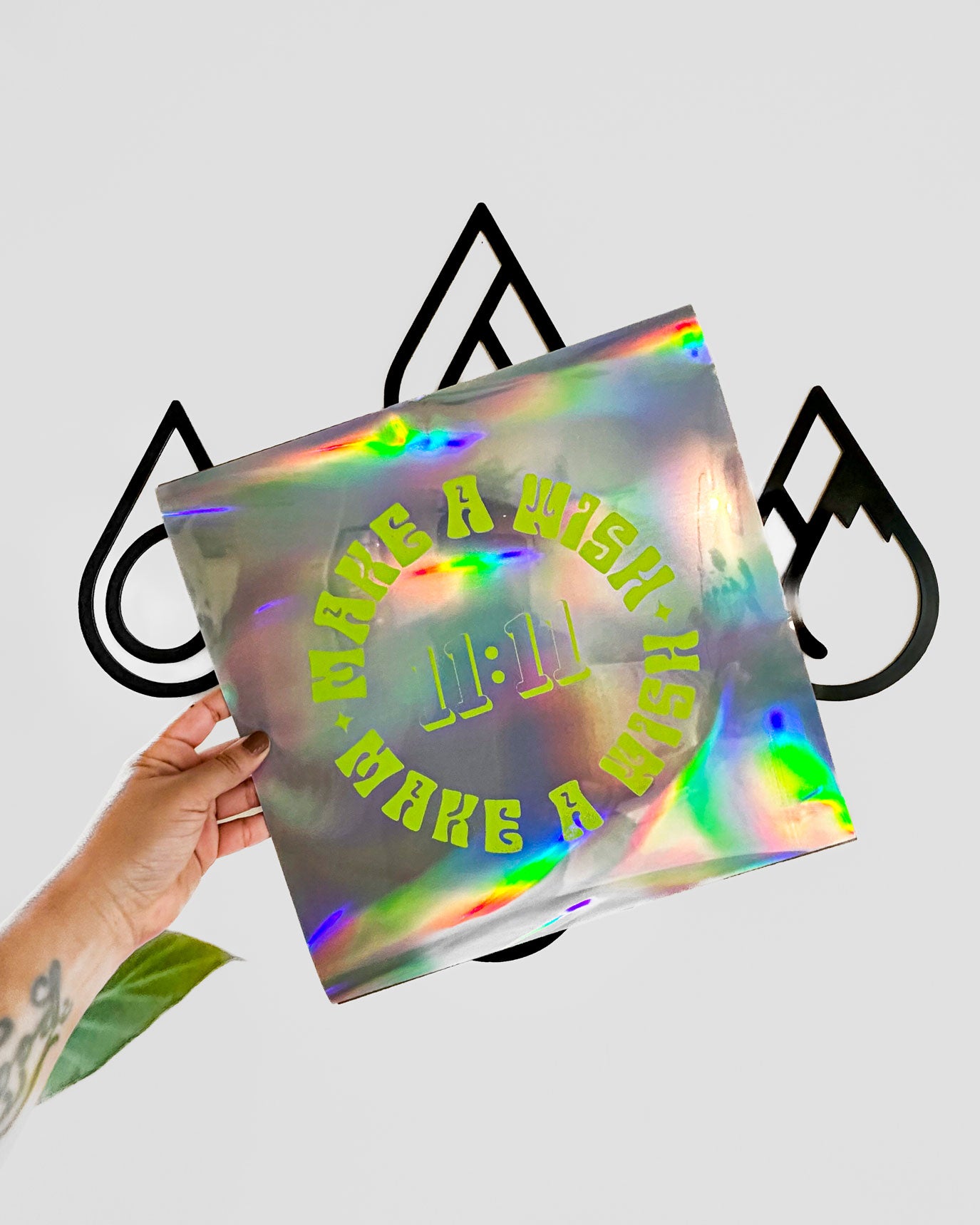 A minimalist design featuring the words "MAKE A WISH," screen printed on 12x12 holographic paper. The reflective surface catches the light, creating a dynamic effect that shifts with your perspective. Perfect as a subtle yet striking reminder of the importance of self-care, this print blends art and mindfulness for any modern space.