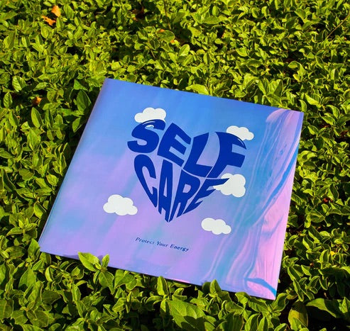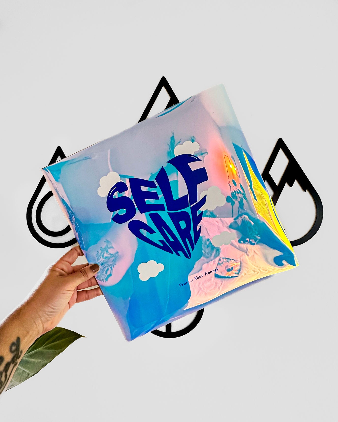 A minimalist design featuring the words "SELF CARE," screen printed on 12x12 holographic paper. The reflective surface catches the light, creating a dynamic effect that shifts with your perspective. Perfect as a subtle yet striking reminder of the importance of self-care, this print blends art and mindfulness for any modern space.